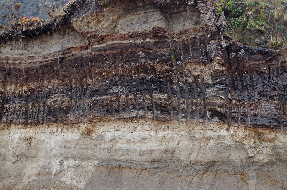 Where the road has cut into the adjacent rock and soil, layers of ash that have been deposited by volcanic eruptions are clearly evident. Along the way, we encountered waterfalls, alpine bogs and wildflowers growing in defiance of an intolerable environment. And, yes, we encountered snowfall at the earth’s equator!