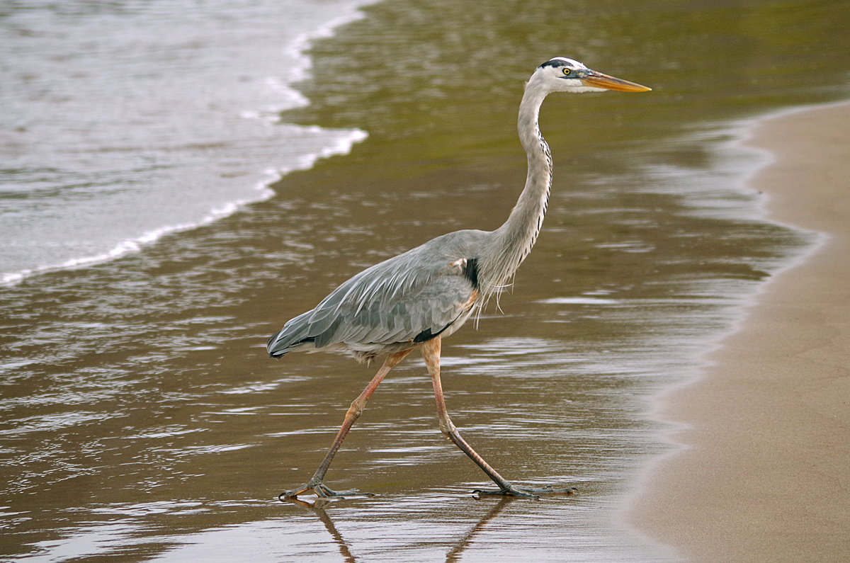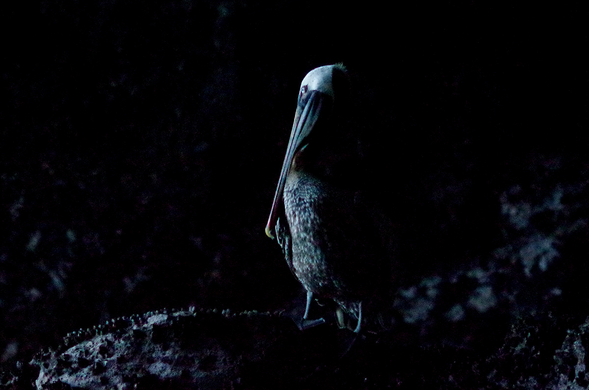 Wednesday’s destination was Isabela Island, where we visited Tagus Cove in the morning. A dry panga landing took us to wooden stairs that climb to the top of the rock face and the entrance to a trail alongside Darwin Lake, with views looking back toward the Grace, at anchor in the bay. There were also views of Darwin and Wolf volcanoes. The afternoon took us to Punta Vicenta Roca, where most of the passengers went on one of many snorkeling expeditions. They snorkeled with a white variety of fish and marine mammals, including Golden Rays. Along the way came another whale encounter. Those of us who did not snorkel explored sea caves in one of the pangas, where we saw Galapagos Penguins, Brown Pelicans, and Blue-footed Boobies. We also encountered amazing numbers of Green Sea Turtles that afternoon. The day’s explorations ended with a sunset panga ride into a mangrove lagoon, with a Great Blue Heron on guard and the Grace in the distance. Half of the passengers explored the lagoon with the kayaks that we towed behind the panga.