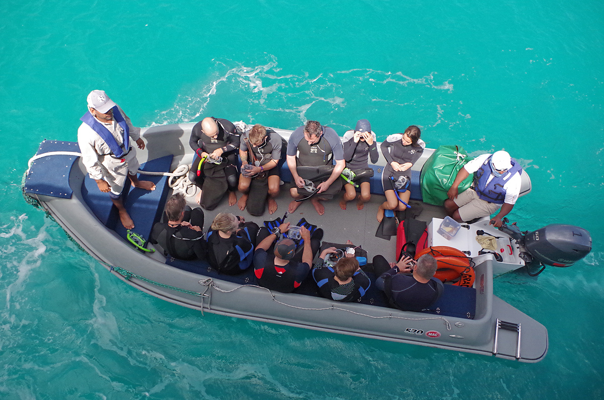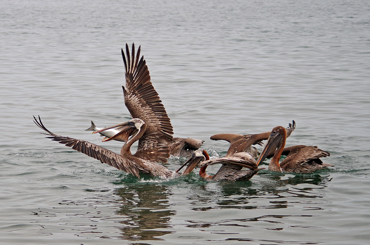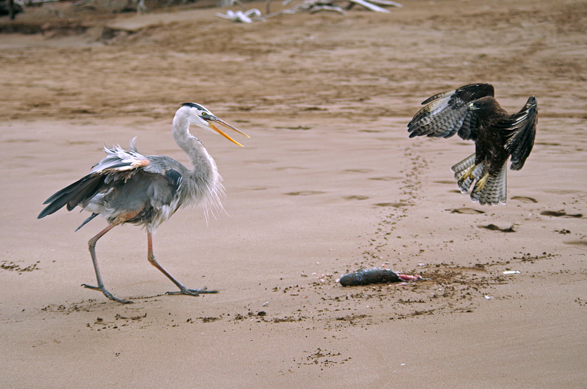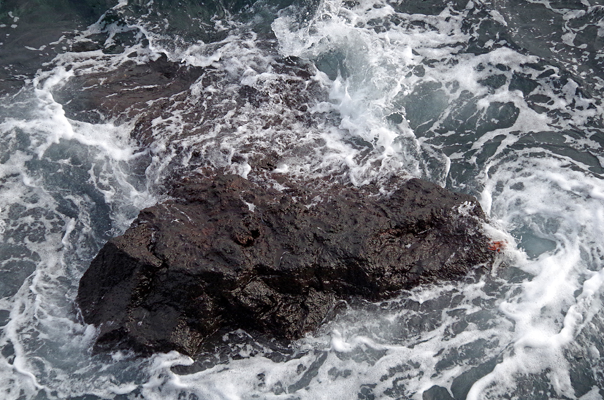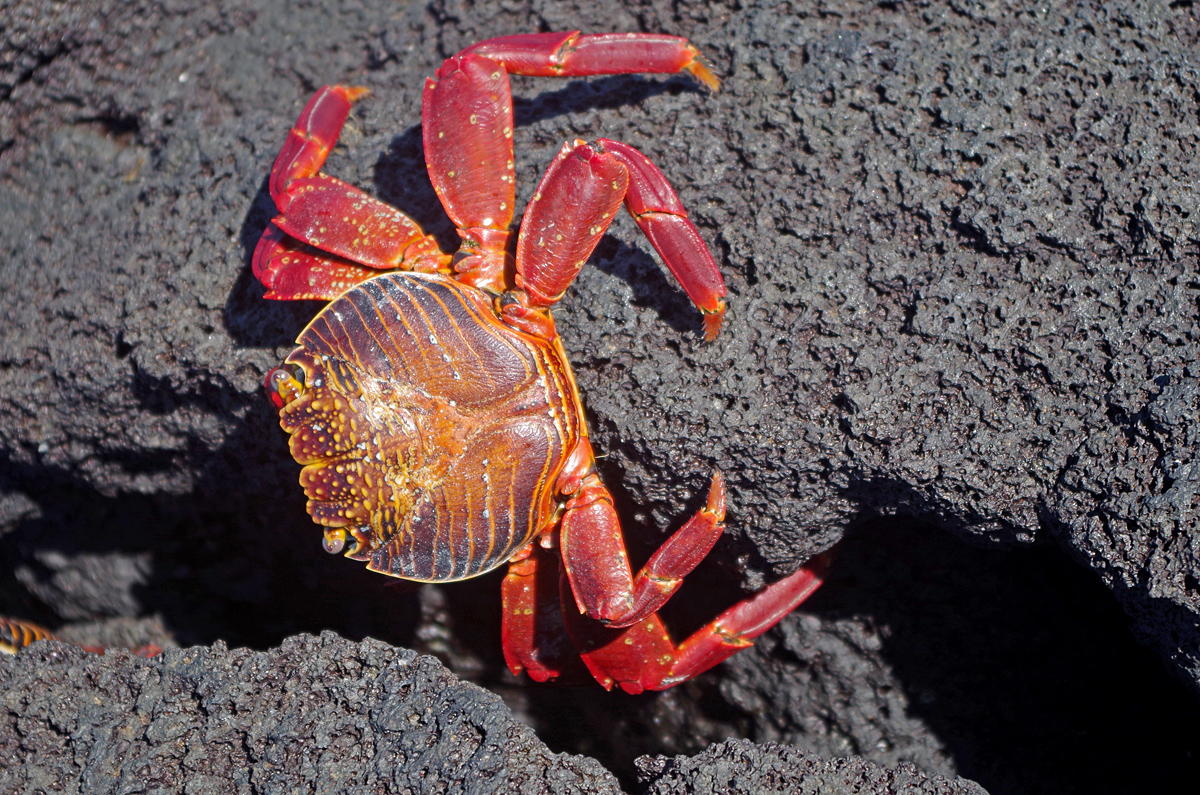 Thursday was a special day because it was Barbara’s birthday! Our adventures took us to Santiago Island’s Espumilla Beach and James Bay, including a lunchtime sail past the aptly-named Monk and Elephant Rocks. At Espumilla Beach, we encountered local fishermen who were catching bait fish using nets. These were the same types of fishing boats that caught up with the Grace each day to provide us with fresh fish, shellfish and lobsters. A group of Brown Pelicans competed for a fish that had been tossed their way by the fishermen, and a remarkable stand-off took place between a Great Blue Heron and a Galapagos Hawk, both wanting to devour the same scrap of fish. James Bay was perhaps our most beautiful land excursion, taking us over lava bridges and crystal-clear blue waters inhabited by Fur Seals, Marine Iguanas and the ever-present Sally Lightfoot Crabs. Some of the lava and stone formations are truly fascinating. The afternoon included another snorkeling opportunity before we returned to the Grace, where our Swedish adventurers dove into the ocean from the upper deck. That evening was Barbara’s birthday dinner.